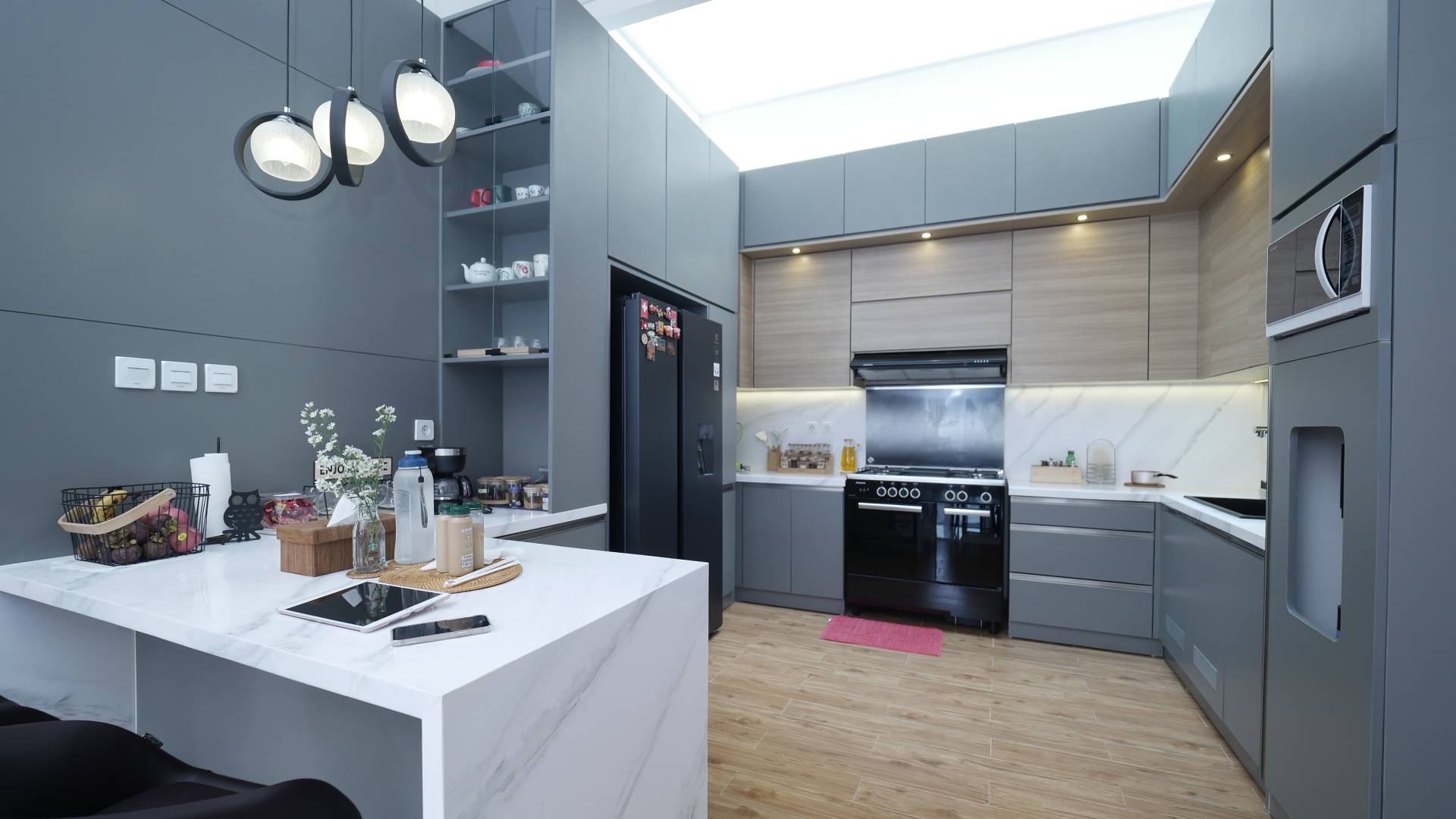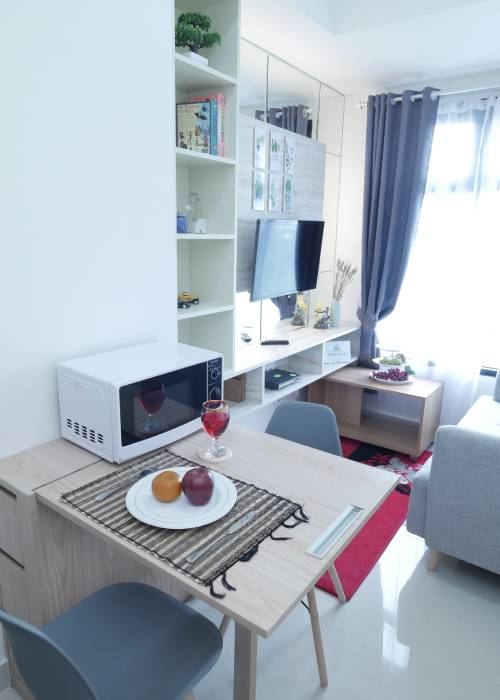 Full furnished home. Kitchen set dengan nuansa biru segar dan backdrop TV yang terkesan futuristik. Kitchen, Bedroom, Dining room